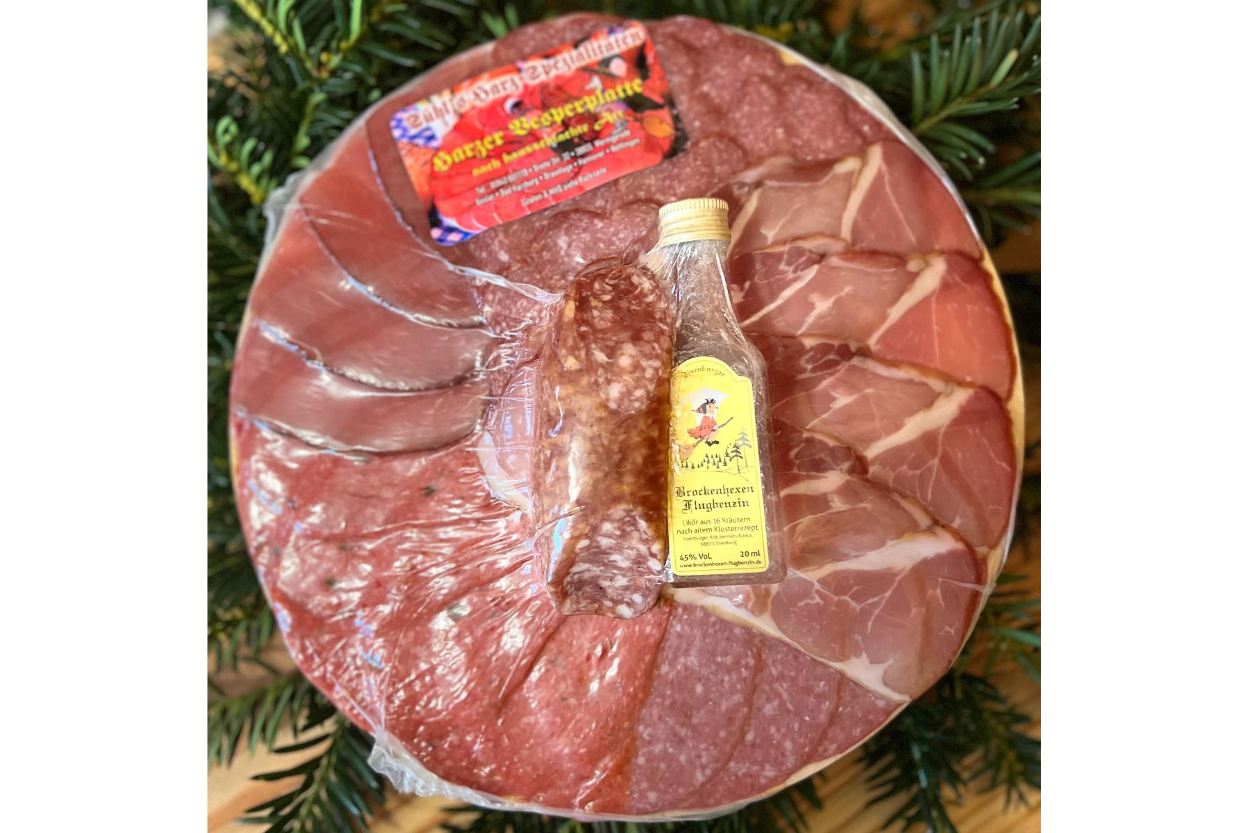 Diese Platten werden bei Bestellung frisch von Sühl’s Harz-Spezialitäten in Wernigerode frisch zubereitet, versehen mit einem Ilsenburger Brockenhexen Flugbenzin 0,02l.