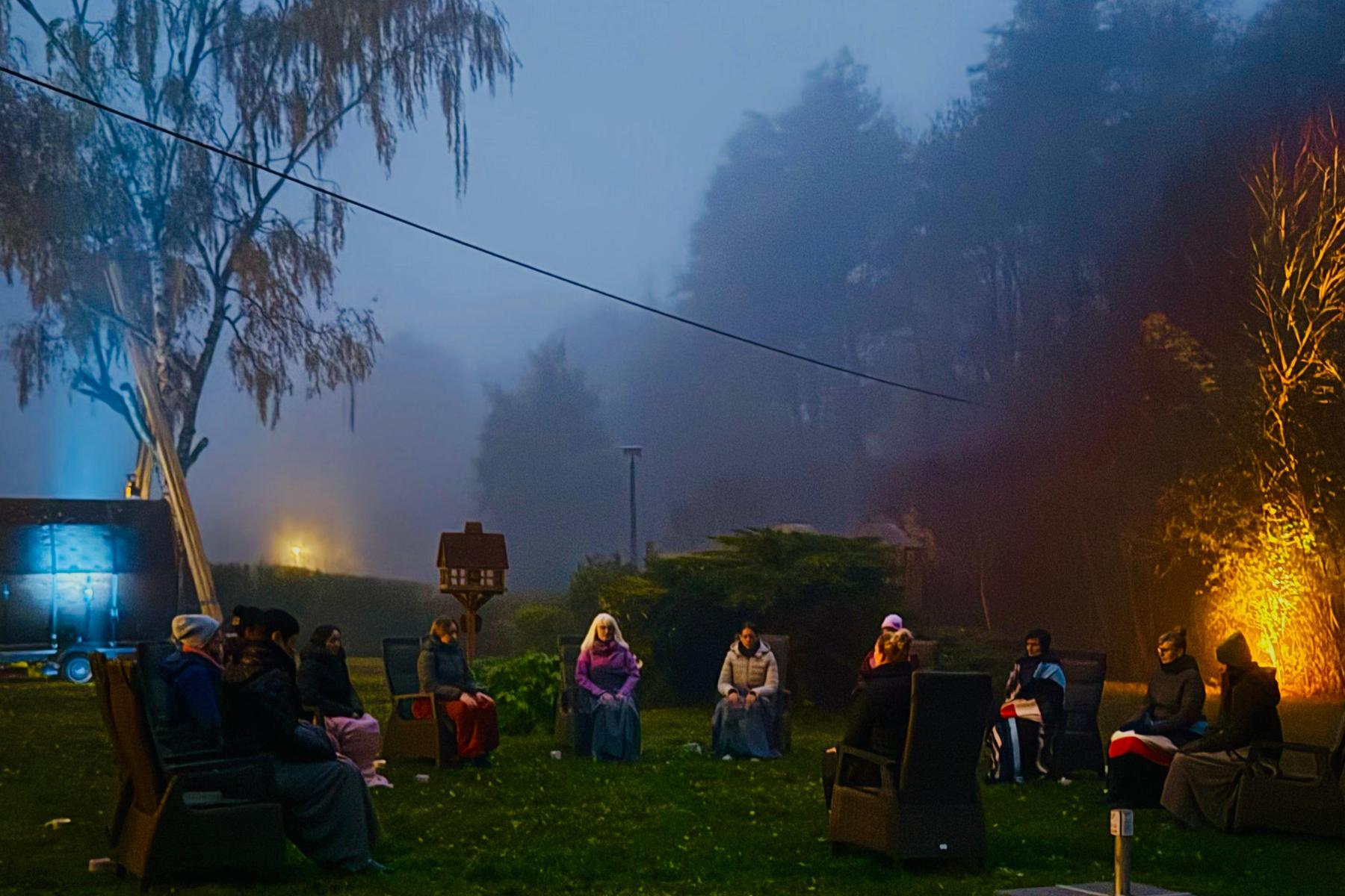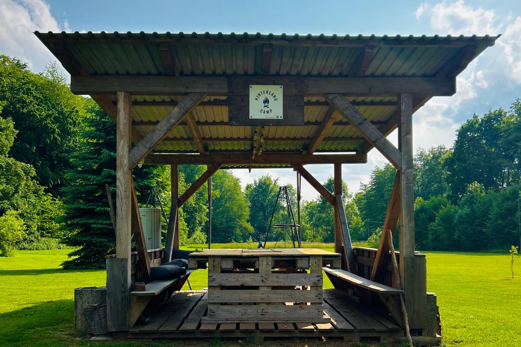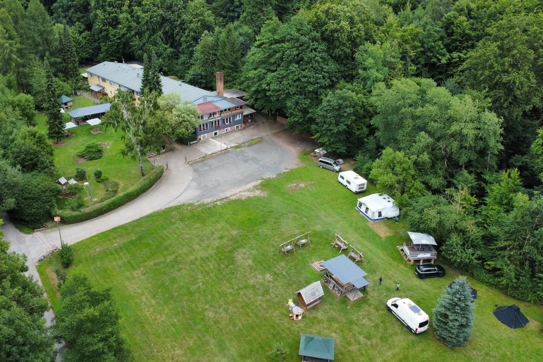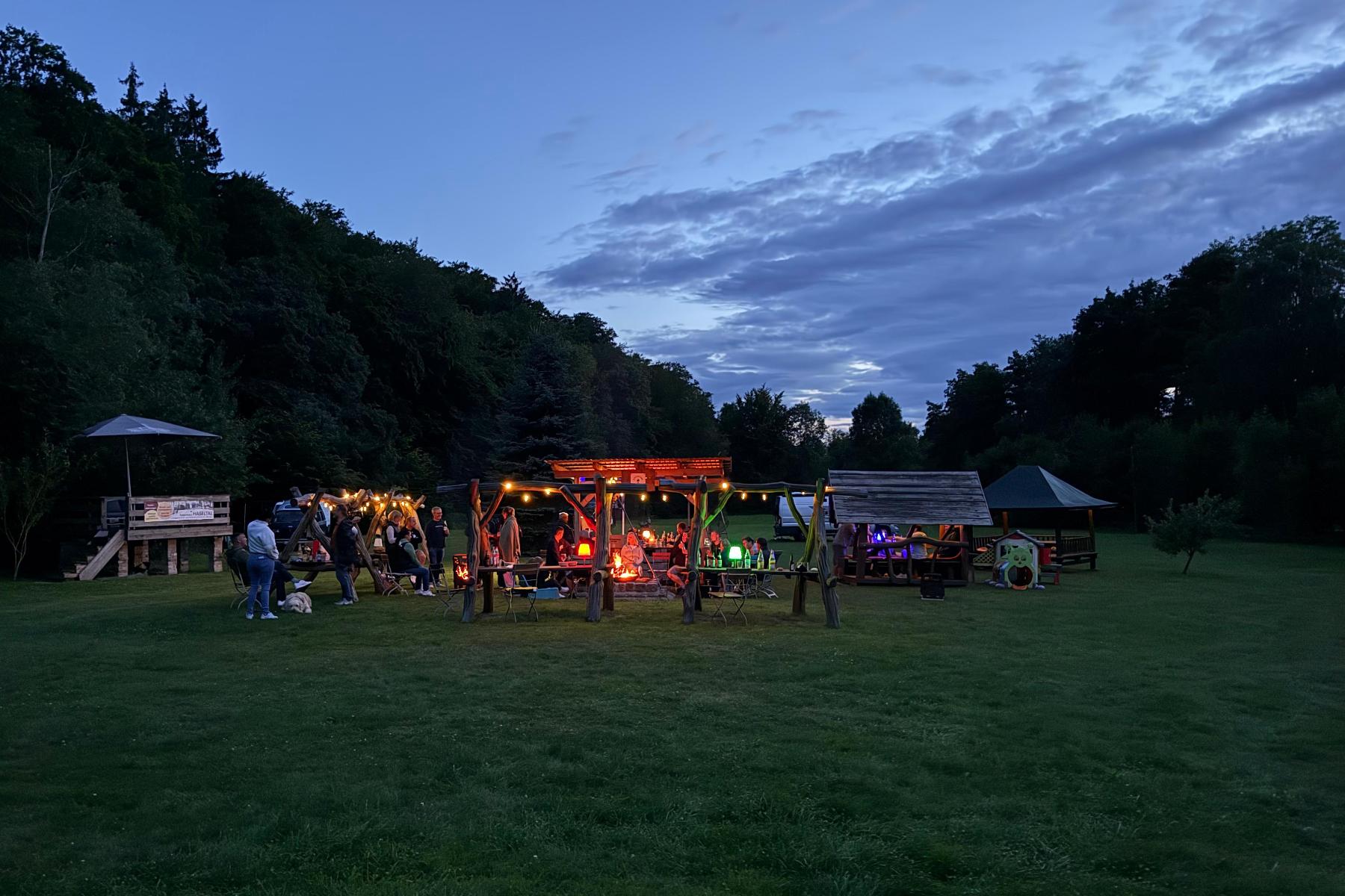 Das großzügige Außengelände bietet viel Platz für gemeinsame Zeit im Freien. Feuerstellen, Grillmöglichkeiten und naturnahe Sitzplätze schaffen eine entspannte Atmosphäre für Gespräche, Lagerfeuerabende oder kreative Pausen. Zusätzlich stehen naturnahe Campingmöglichkeiten zur Verfügung, wodurch sich das Haus flexibel an unterschiedliche Gruppengrößen anpassen lässt.