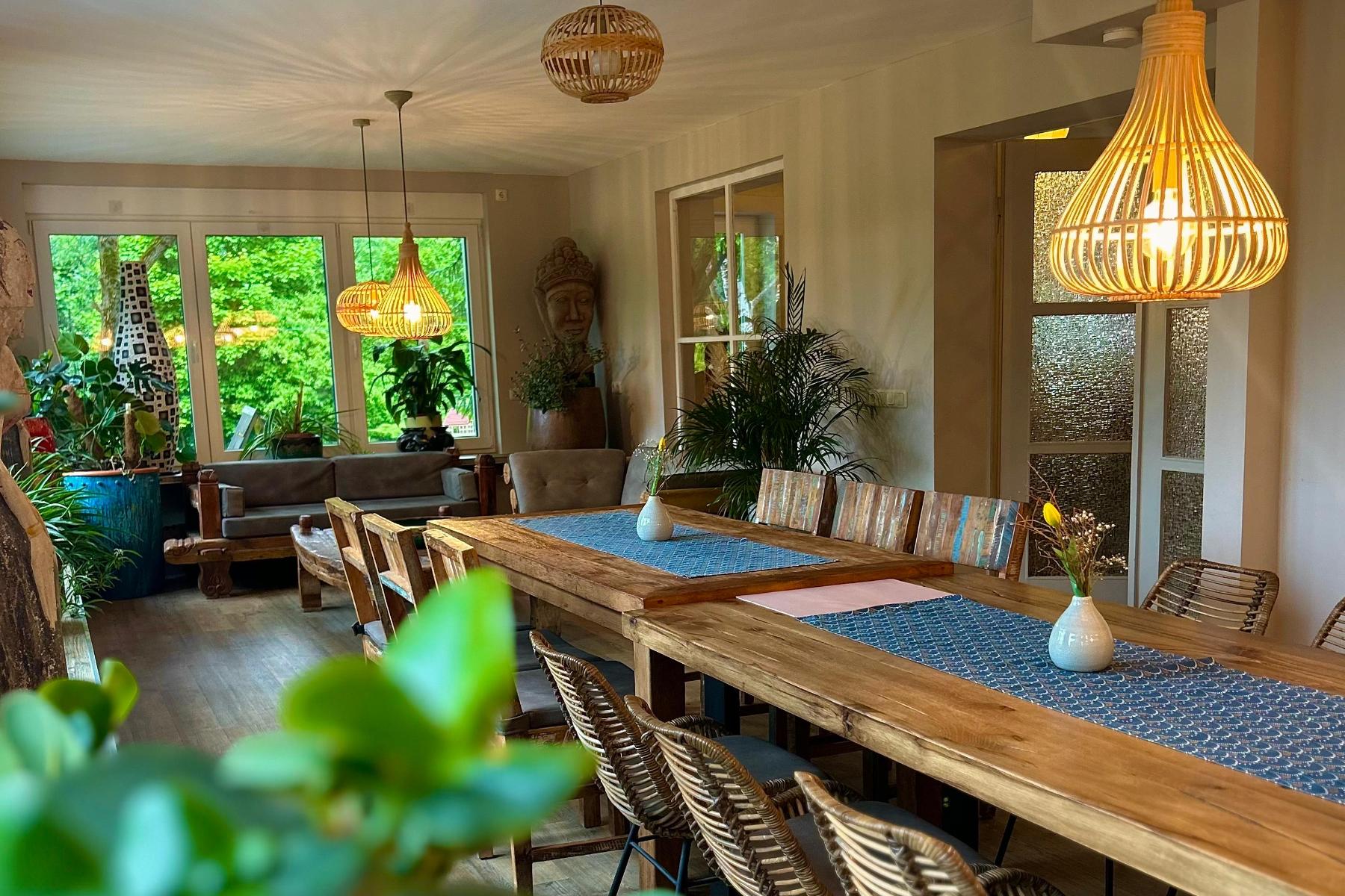 Das Haus verfügt über mehrere individuell eingerichtete Wohneinheiten mit eigenem Bad und Küche. Dadurch lassen sich Gemeinschaft und Rückzug gut miteinander verbinden – ein großer Vorteil für Gruppen mit unterschiedlichen Bedürfnissen. Ergänzt wird das Angebot durch weitläufige Gemeinschaftsflächen, einen Wintergarten, einen Saal für Gruppenaktivitäten sowie gemütliche Aufenthaltsbereiche.